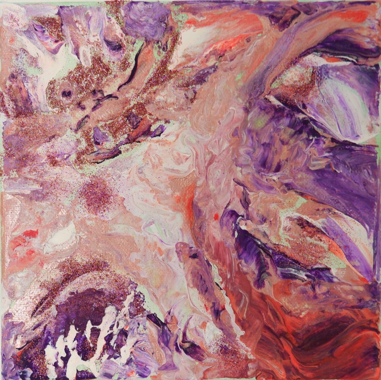 Son approche prend racine dans le corps et le ressenti. Le geste guide, la matière répond, et la toile devient un espace où ce qui se transforme à l’intérieur peut prendre forme.